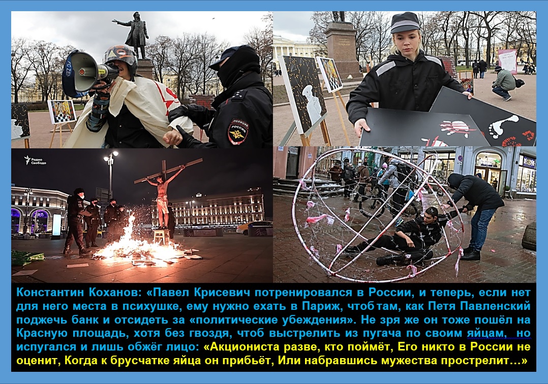 Константин Коханов: «Крисевич с Павленским акционисты, не хулиганы, а просто больны, к ним в кожанках ночью приходят чекисты, считая художников просто бл-дьми».