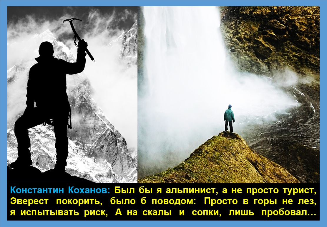 Константин Коханов: Был бы я альпинист, а не просто турист, Эверест покорить, было б поводом: просто в горы не лез, я испытывать риск, а на скалы и сопки, лишь пробовал:
