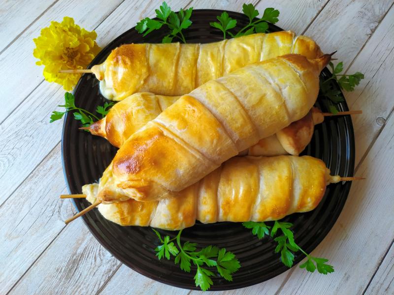 - Нанизываем сулугуни на шпажки и оборачиваем их лентой из слоеного теста, делая витки внахлест друг на друга.