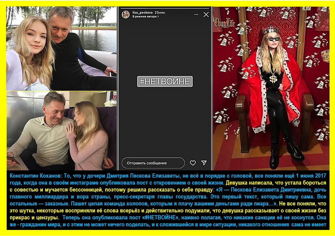 Константин Коханов: Дмитрий Песков, конечно, как отец, за свою дочь Елизавету не отвечает, хотя она во время денацификации Украины на своей личной странице в Instagram выразила свою пацифистскую позицию «НЕТВОЙНЕ». Правда, считающие себя порядочными люди, попав в такую неприятную ситуацию (так тоже можно назвать предательство близкого человека), уходят в отставку, а имеющие ещё в душе, хотя бы каплю совести – на фронт.