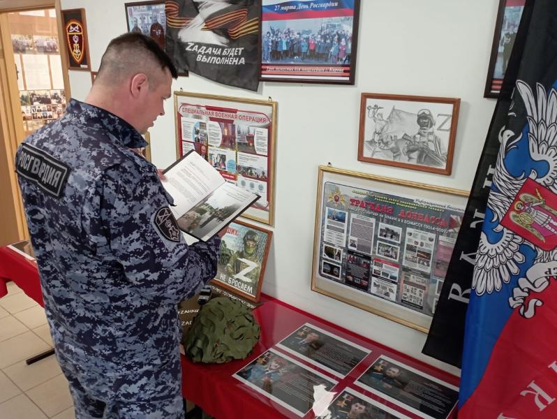 На данный момент в ней представлены такие экспонаты, как флаг Донецкой Народной Республики, привезенный сотрудниками из зоны СВО, памятная книга «Преодоление», которой был награжден сотрудник вневедомственной охраны Александр Адеков, спасший ребенка, провалившегося в яму, наполненную грунтовой водой, а в центре – информационный плакат с информацией о целях и задачах СВО, а также рассказ о событиях на Украине и в Донбассе с 2014 по 2022 годы.