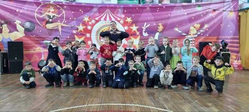 В спортивном зале образовательного учреждения собралось много ребят. Дети с восторгом наблюдали за мастерством жонглеров и акробатов, веселые клоуны Малыш и Ромашка порадовали смешными репризами. Артисты цирка показали номера «Икарийские игры», «Фламенко», Колесо Сира, эквилибр на рулях и групповую скакалку «Дети гор».