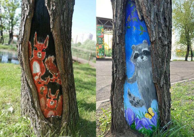 В парке «Фабричный пруд» таким образом спасли два дерева: на одном выглядывают семейство белочек (художник Светлана Лукьянова), а на втором – енот (художник Ксения Ивашина).