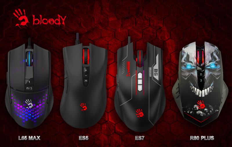 Bloody, бренд компьютерной периферии для геймеров, выпустил четыре модели мощных мышей. Киберспортивные игровые манипуляторы ES5 и ES7 представлены в корпусе черного цвета. Игровая мышь L65 Max выполнена в классическом черном, а также неожиданно-ярких цветах – черно-фиолетовом, розово-голубом и желто-фиолетовом. Беспроводная игровая модель R80 Plus Skull отличается от остальных рисунком в виде фантастического черепа на черном фоне.
